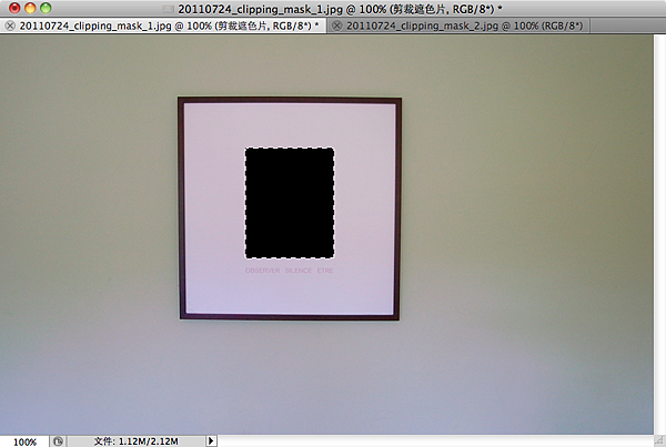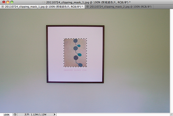 現在,我們要開始污染(編輯)這個乾淨無暇的剪裁遮色片圖層,我們要先用矩形選取工具把掛畫中原本的影像選取起來。