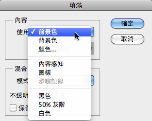 在填滿的對話框中,選取前景色,再按下確定,你當時的前景色就會被填入畫面中囉!