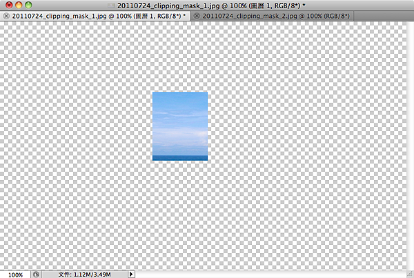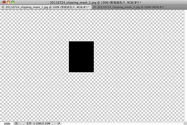 你看看,除了我們畫出來的黑色色塊外,其他的部份都是透明的,在Photoshop中,透明的部份用淺灰色格子來表示。所以,目前我們看到的這個圖層,就是我們等一下要拿來作為剪裁遮色片的圖層,而它的形狀是矩形。