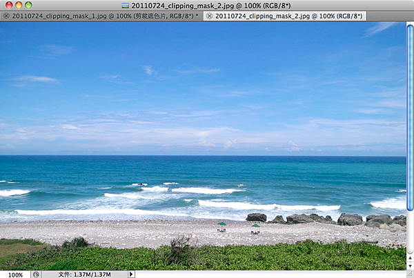 利用選取/全部、編輯/拷貝兩個指令,將無敵海景的影像拷貝起來。然後再切換到原本製作中的檔案,執行編輯/貼上,將海景影像貼在剪裁遮色片圖層的上面。