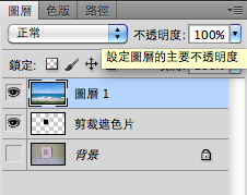 看到沒,背景圖層的上面出現了一個新圖層,新圖層就像一個新生的小baby,純淨得一塵不染,所以新圖層是完全透明的,上面沒有任何影像。為了方便辨識,我們在新圖層的名稱(圖層一)上雙擊滑鼠左鍵,把它命名為剪裁遮色片。