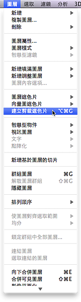 看好囉!我們要執行最重要的一個指令囉!請點選海景圖層(圖層1)後,執行圖層/建立剪裁招色片指令,路徑如下: