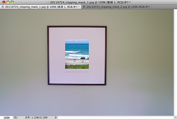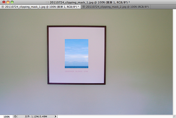 首先,我們先在Photoshop裡開啟練習圖檔一,他是拍攝牆壁上一幅掛畫的照片,而我們要做的,就是將掛畫的內容,利用剪裁遮色片,換成另外一個影像。