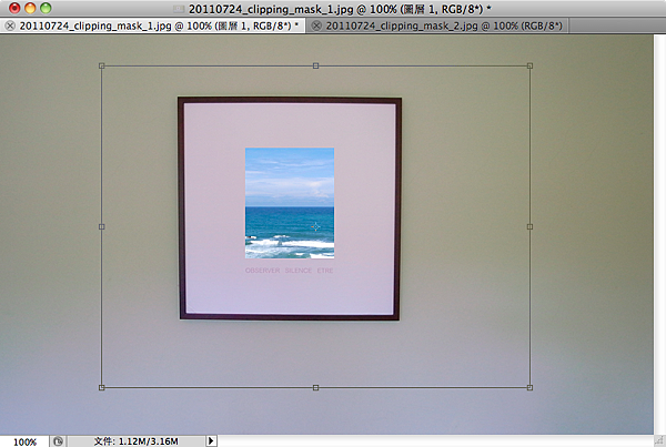 不過目前的海景看起來好像沒有顯示到重點,但是沒關係,使用剪裁遮色片的好處,就是無論是被剪裁的圖層,還是剪裁別人的圖層,都還是可以個別調整。所以我們將圖層1進行編輯/任意變形,調整到適當的顯示區域。