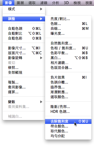 對灰階圖層執行影像/調整/去除飽和度指令。