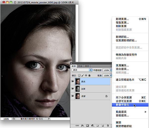 請點選圖層面版右上角的小圖案,就會出現一些圖層相關的選項,請選擇影像平面化,就可以把目前的三個圖層合併為一個圖層。不過合併之後,就不能再針對單一圖層進行調整囉!