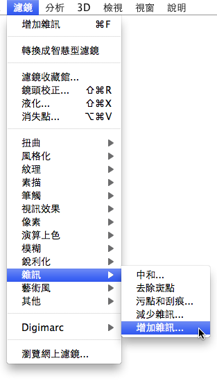 接著我們要為這個影像加上雜訊效果,模擬底片顆粒的感覺。請執行濾鏡/雜訊/增加雜訊指令。