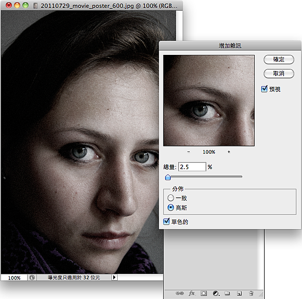 總量的部份根據你準備的影像不同,需要設定不同的值,不過它是會產生即時預覽的,所以你可以一邊調整一邊看效果,調到你高興為止,原則上就是顆粒你看得出來,但是又不要大到像痘子那麼大顆就可以了!分布的選項有分一致與高斯兩種,一致的顆粒比較均勻,而高斯的顆粒則有大有小。最後請把單色的選項勾起來,這樣才不會出現彩色的雜訊。