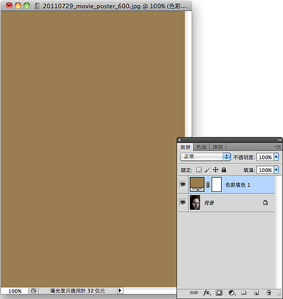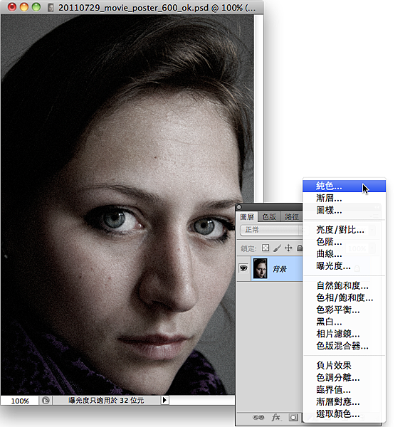 最後,我們要模擬海報,加上淡淡的黃色調,這裡我們要使用純色圖層來製作,所以請點選圖層面版下方,新增純色與調整圖層的按鈕,並選擇最上方的純色圖層。